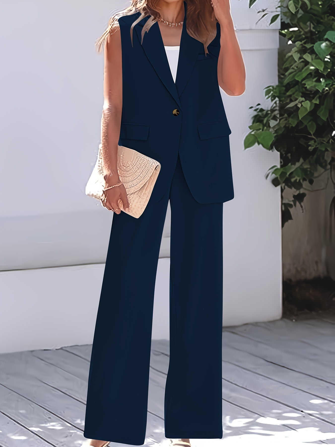 Plus Size Elegant Plain Suit Set, Single Breasted Sleeveless Vest & Straight Leg Pants Outfits, Women's Plus Size Clothing