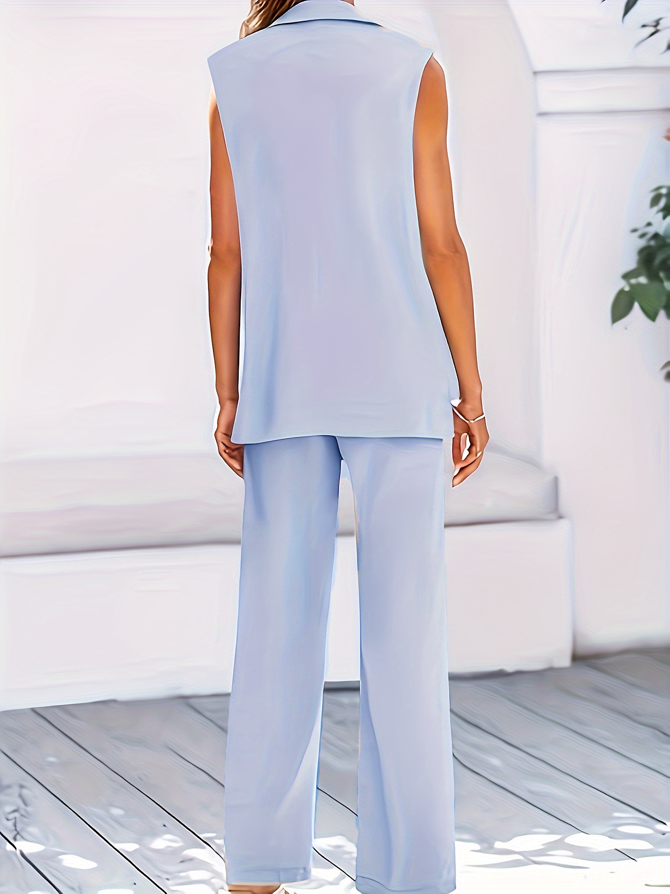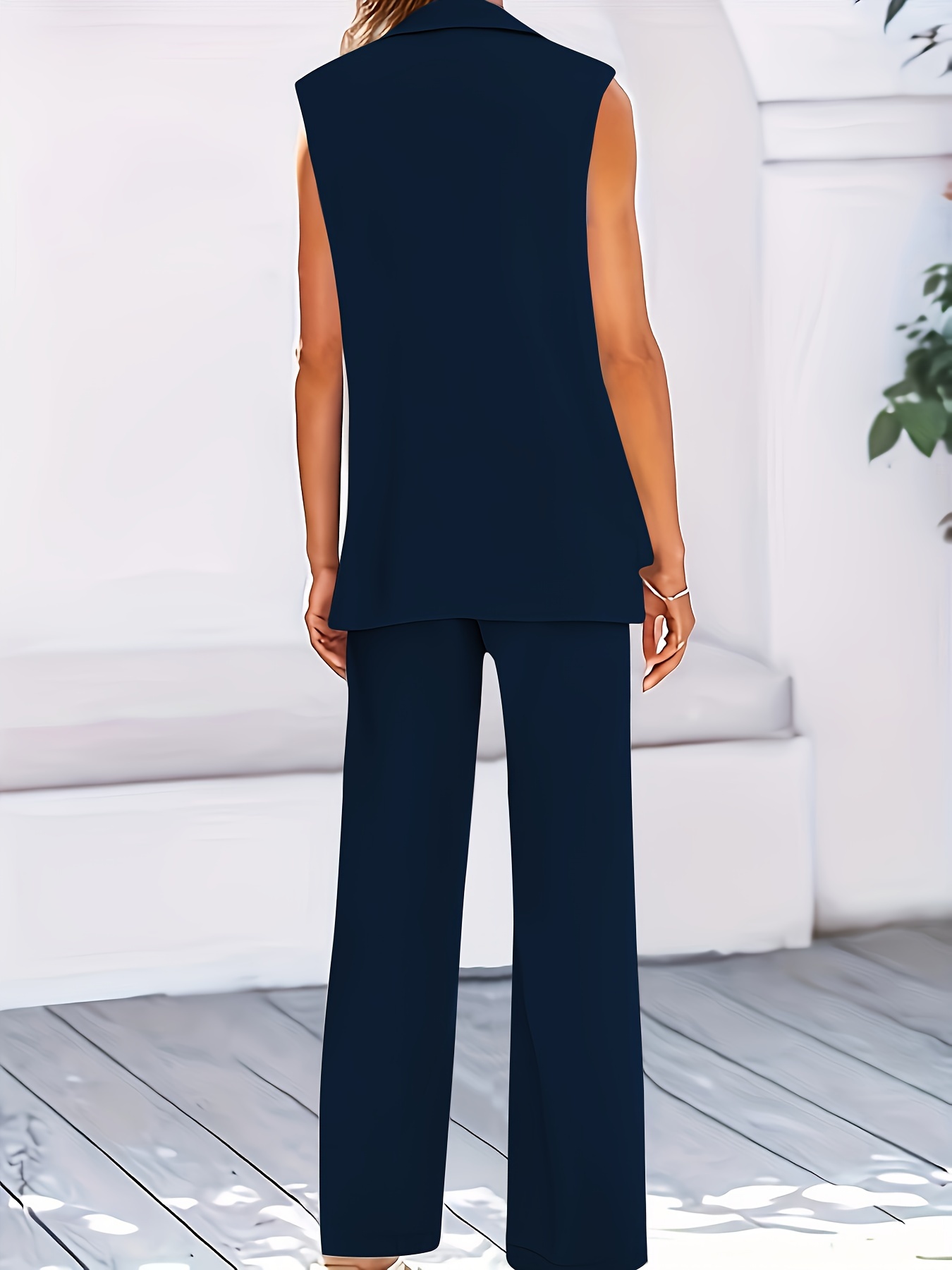 Plus Size Elegant Plain Suit Set, Single Breasted Sleeveless Vest & Straight Leg Pants Outfits, Women's Plus Size Clothing