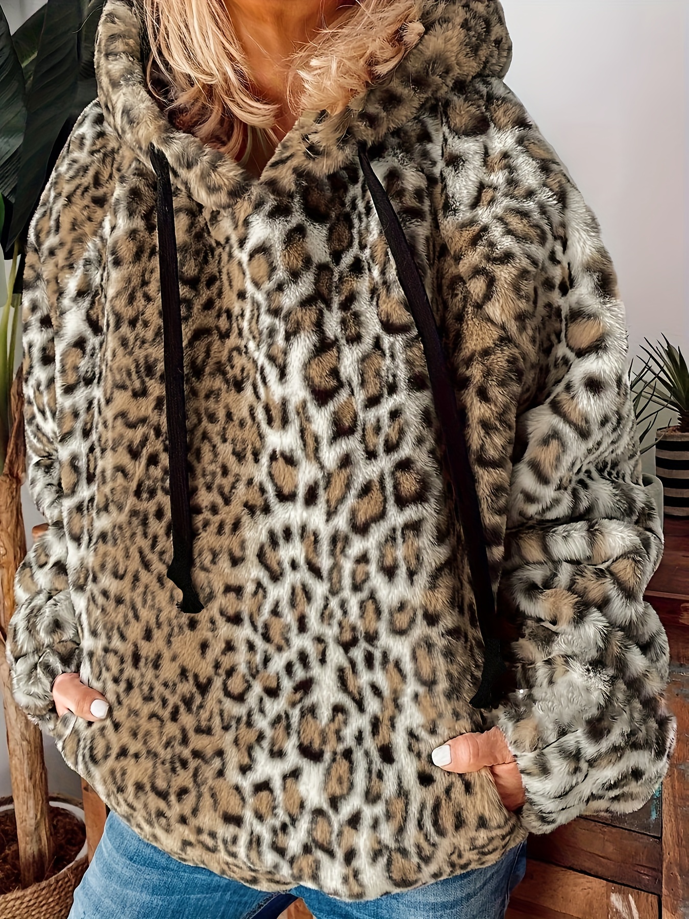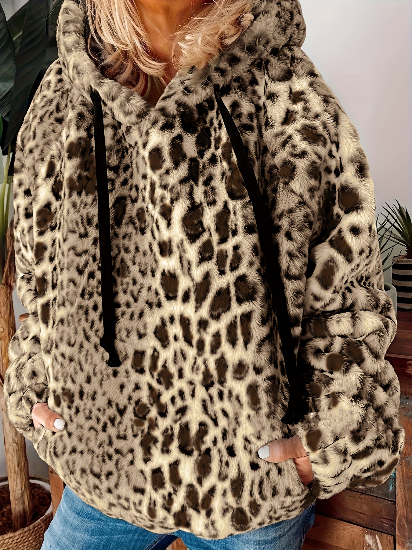 Plus Size Leopard Print Hoodie - Ultra-Soft Fleece Long Sleeve Drawstring Sweatshirt with Spacious Pockets for Women - Vibrant Print Design, Adjustable Fit, and Cozy Comfort
