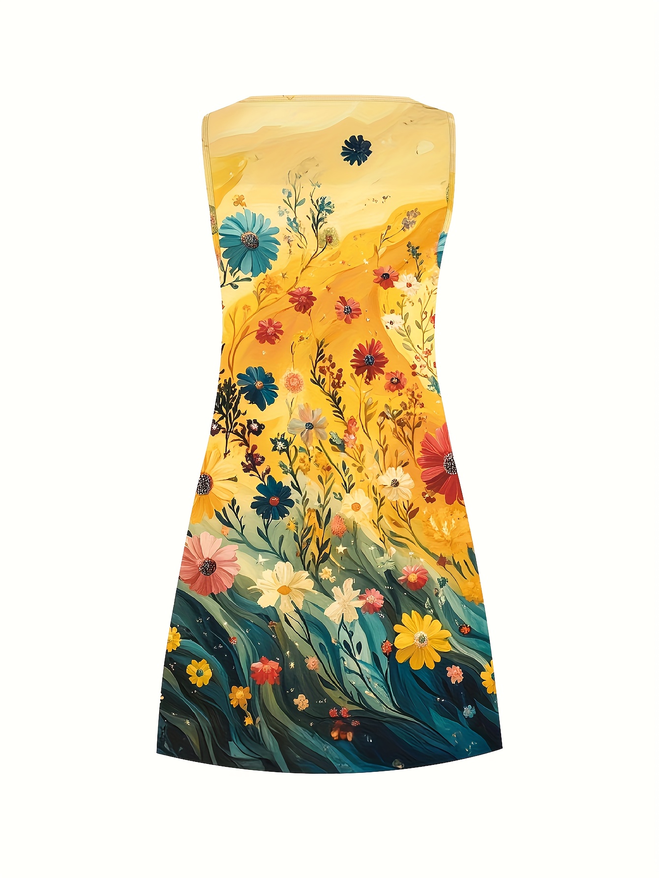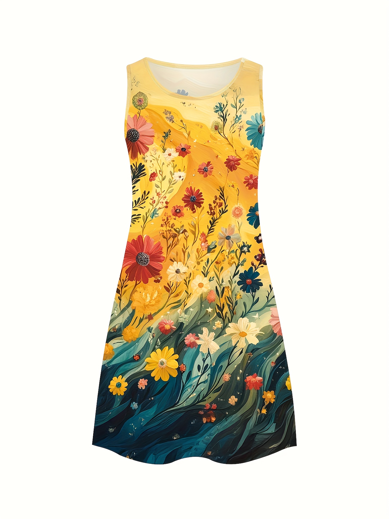 Women's Plus Size Tropical Floral Print Sleeveless A-Line Tank Dress - Vibrant Yellow to Blue Gradient, Lightweight Breathable Casual Summer Vacation Dress, Machine Washable, Casual Summer Dresses, Beach Attire, Gradientshaped Fashion, Easycare Fabric