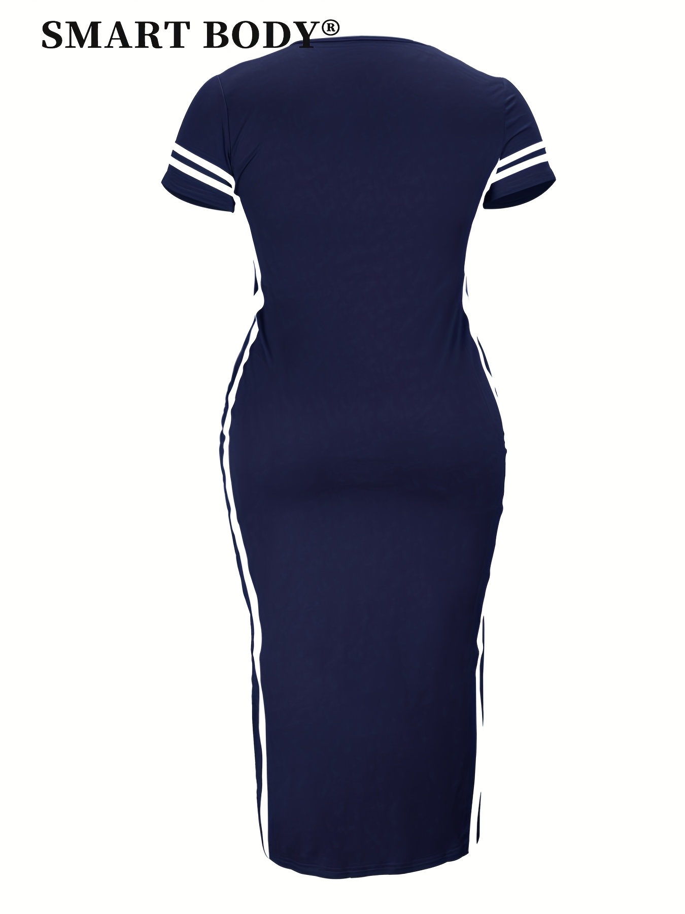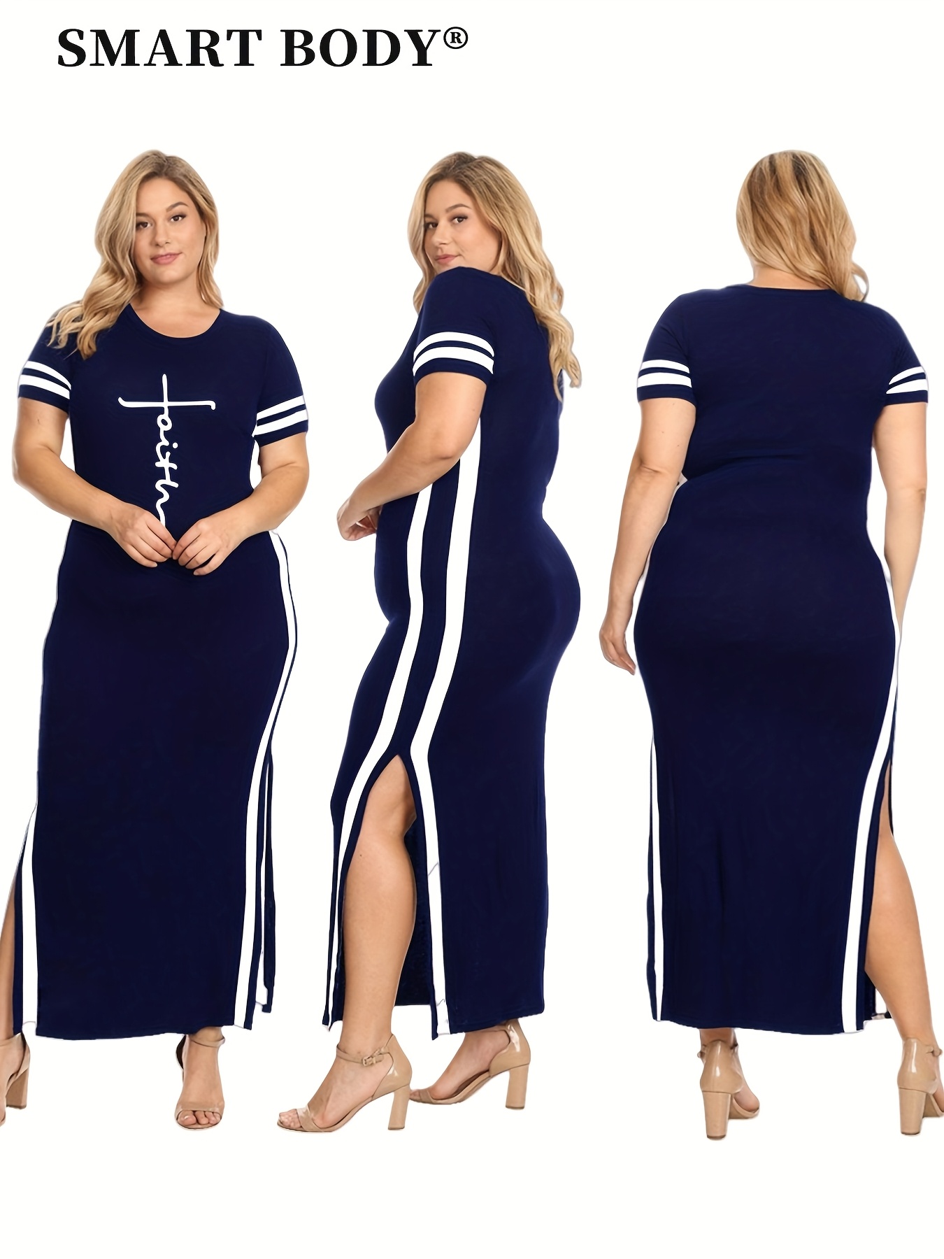 Faith Letter Women'S Striped Printed Casual Dress Side Slit Round Neck Short-sleeved Dress, Spring And Summer Casual WomenS Maxi Dress Striped Trim Split Thigh Longline Dress For Summer
