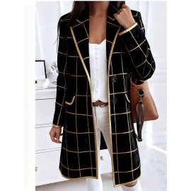 Elegant Plus Size Double-Breasted Blazer - Chic Plaid, Long Sleeve Suit Jacket for Women, Machine Washable