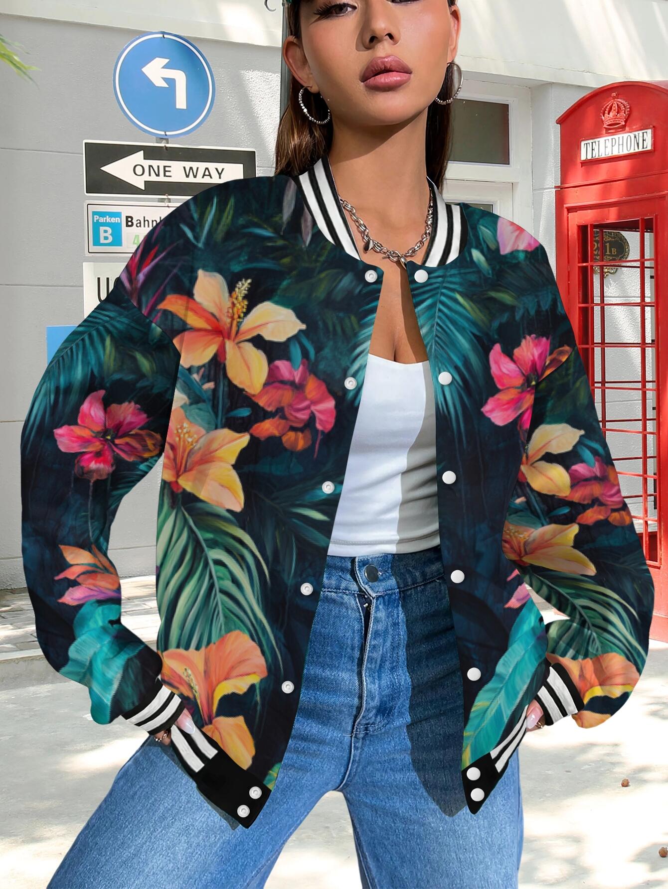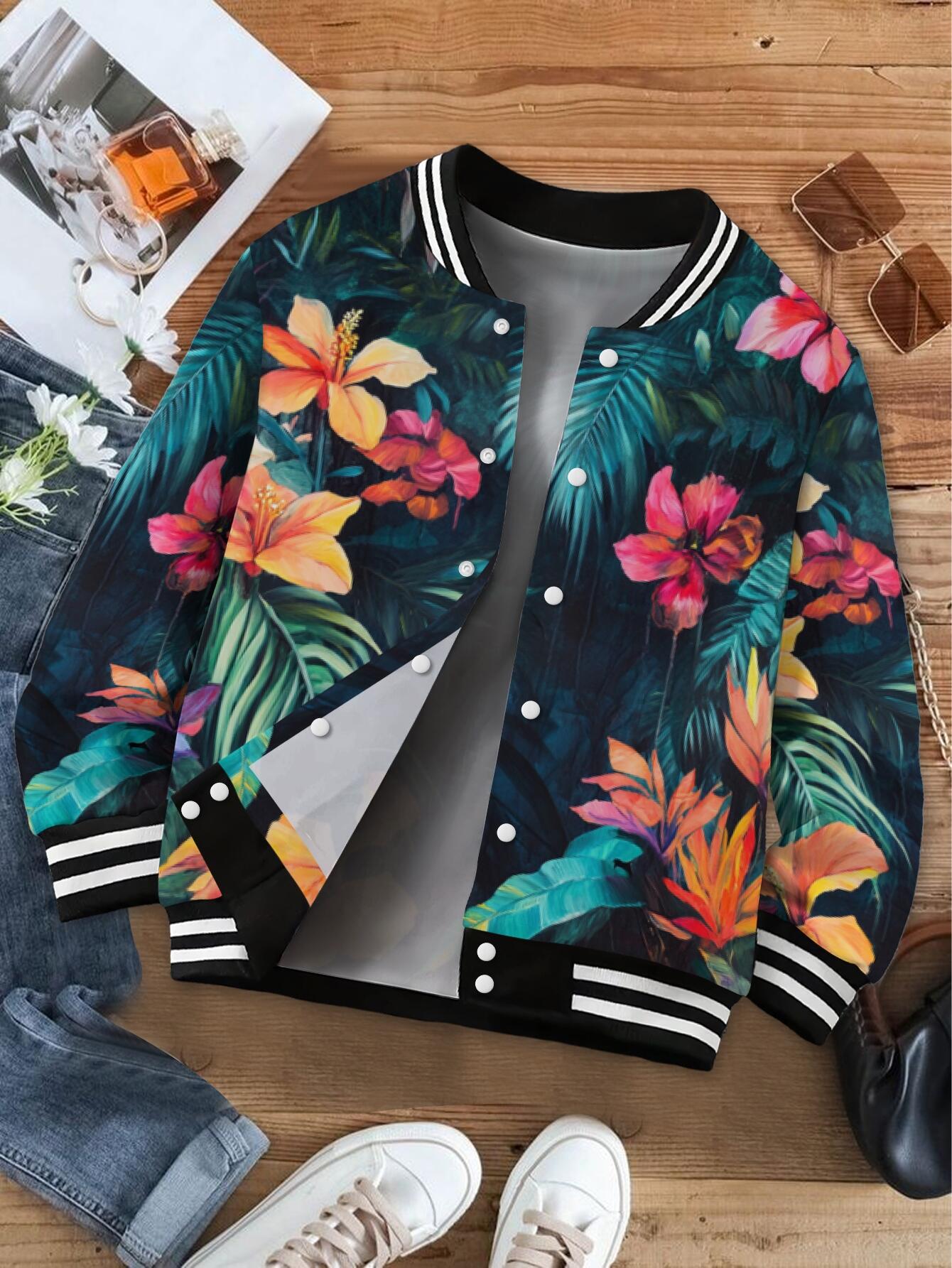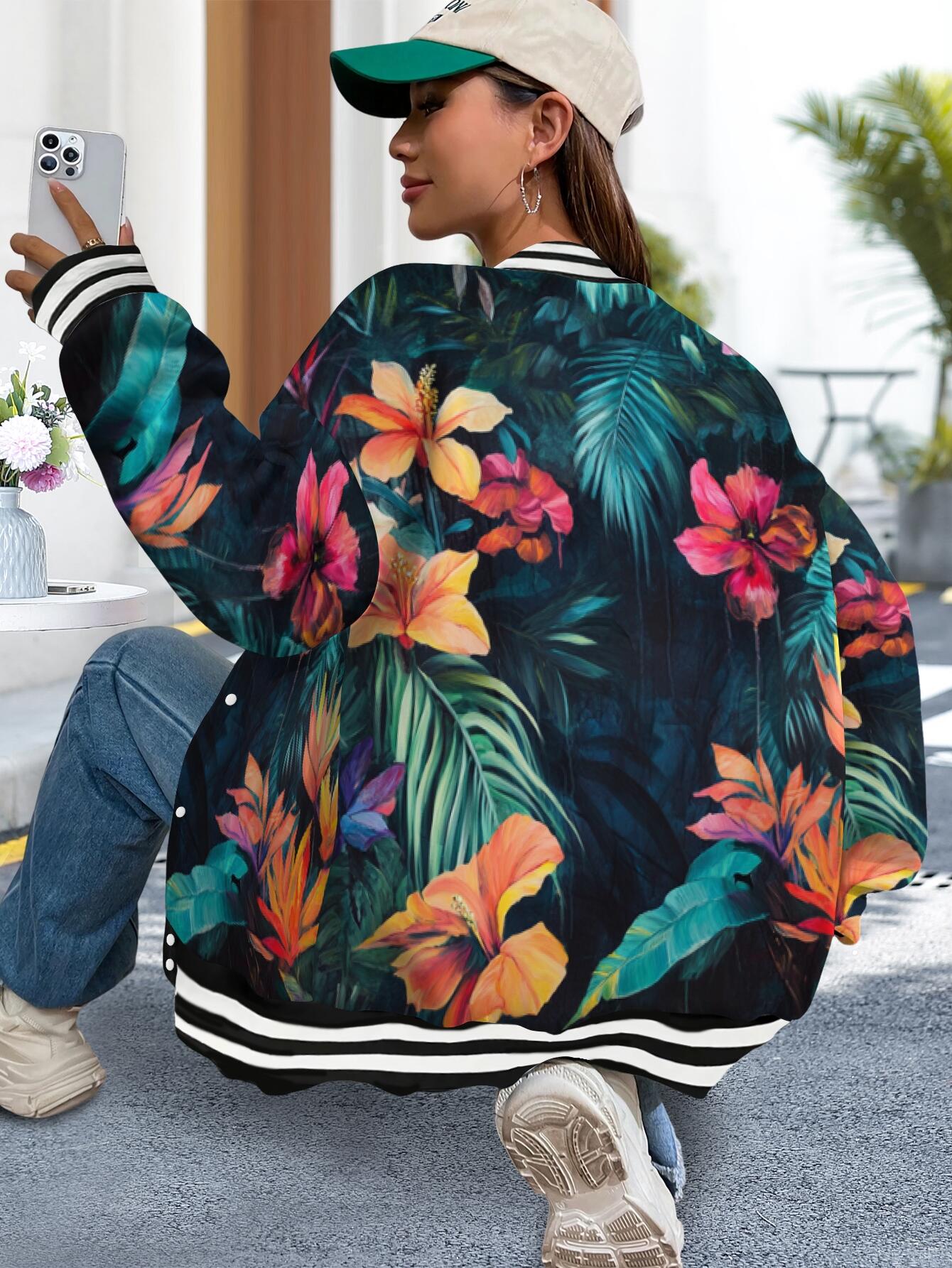 Plus Size Women's Hawaiian Print Baseball Jacket Hoodie - Tropical Hibiscus & Palm Leaf Aloha Coat, Lightweight Long Sleeve Split Hem Hawaiian Shirt Style Outerwear for Vacation, Beach Parties & Year-Round Casual Wear