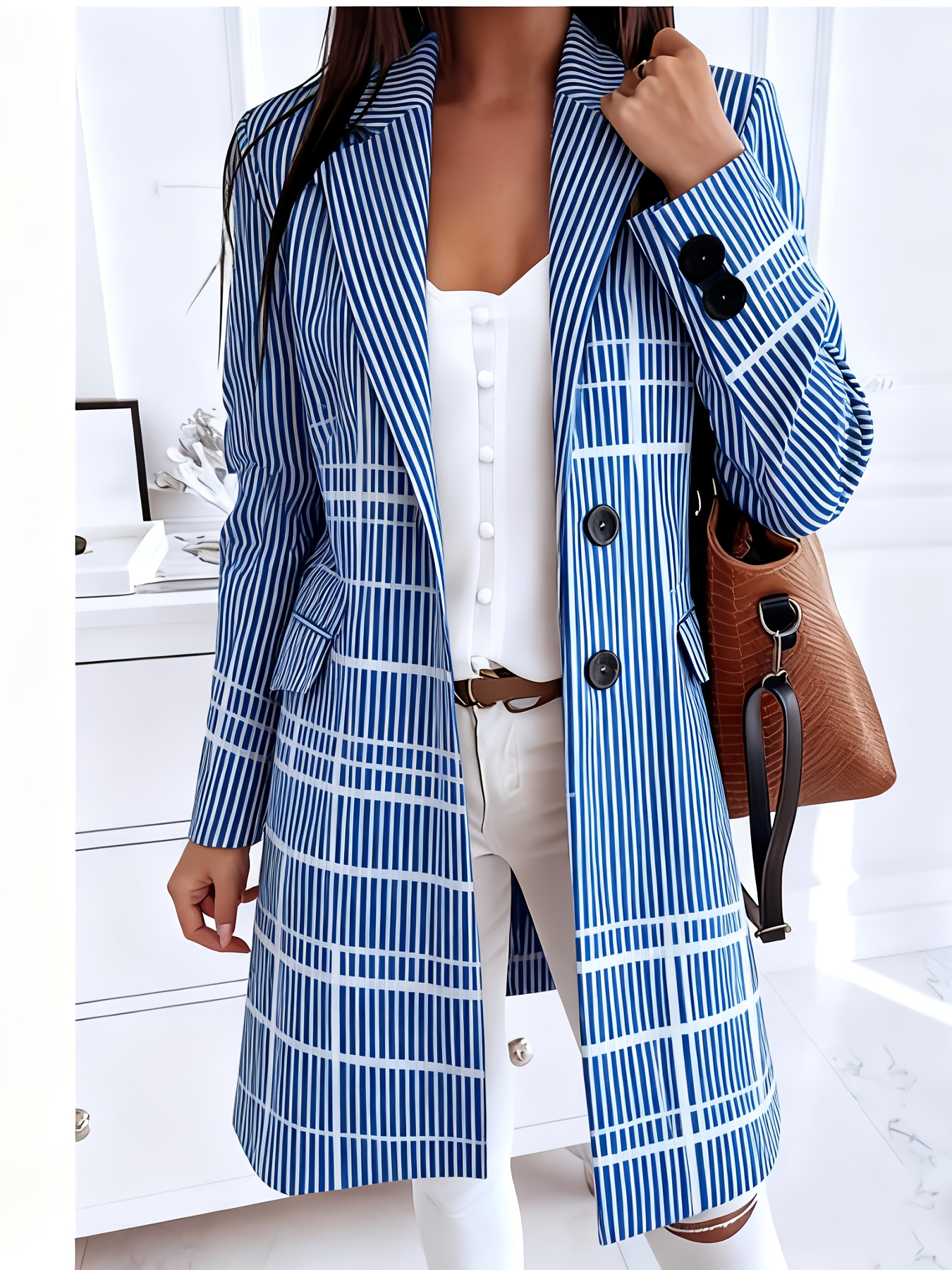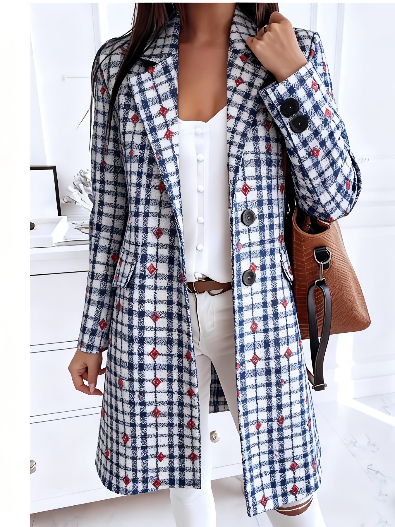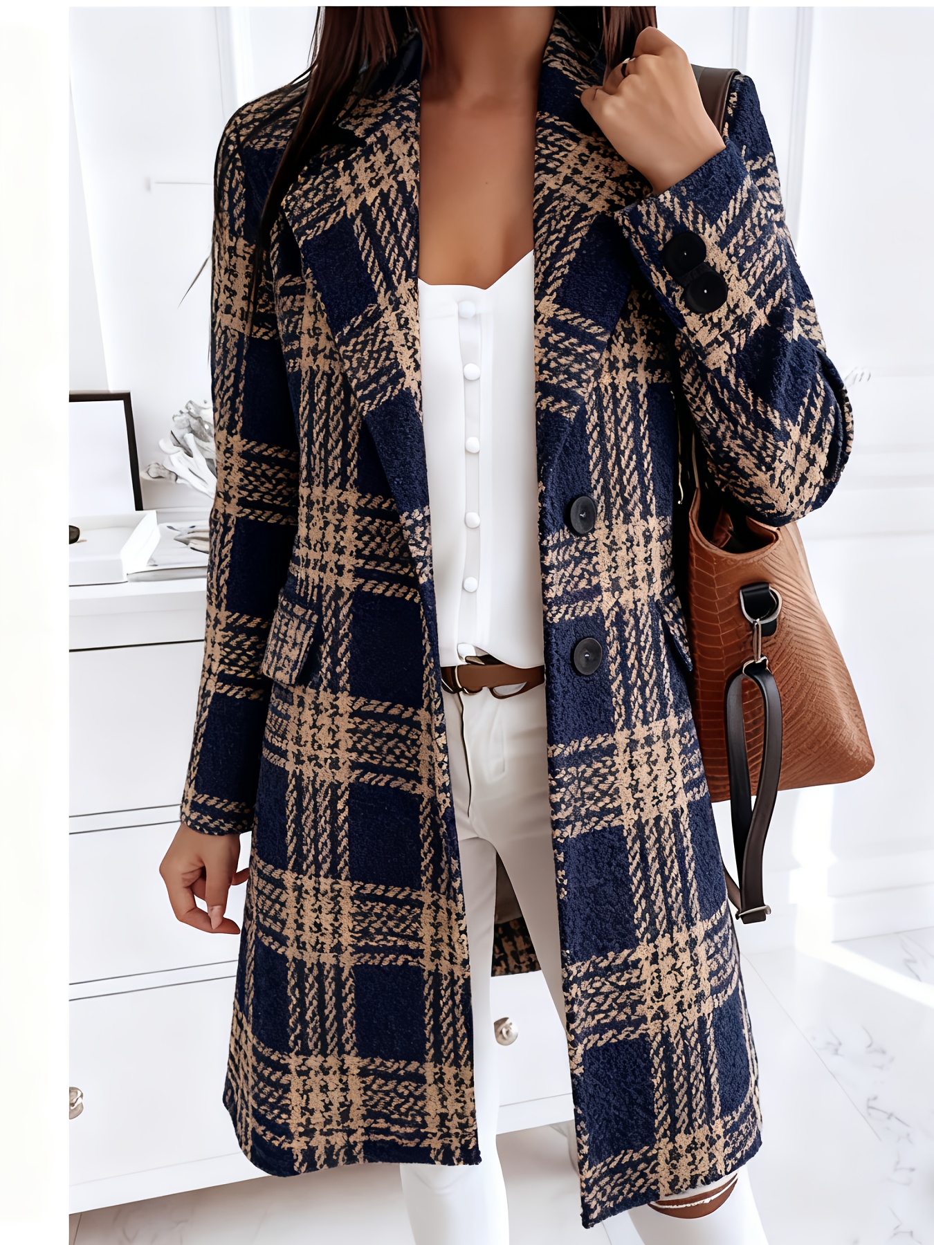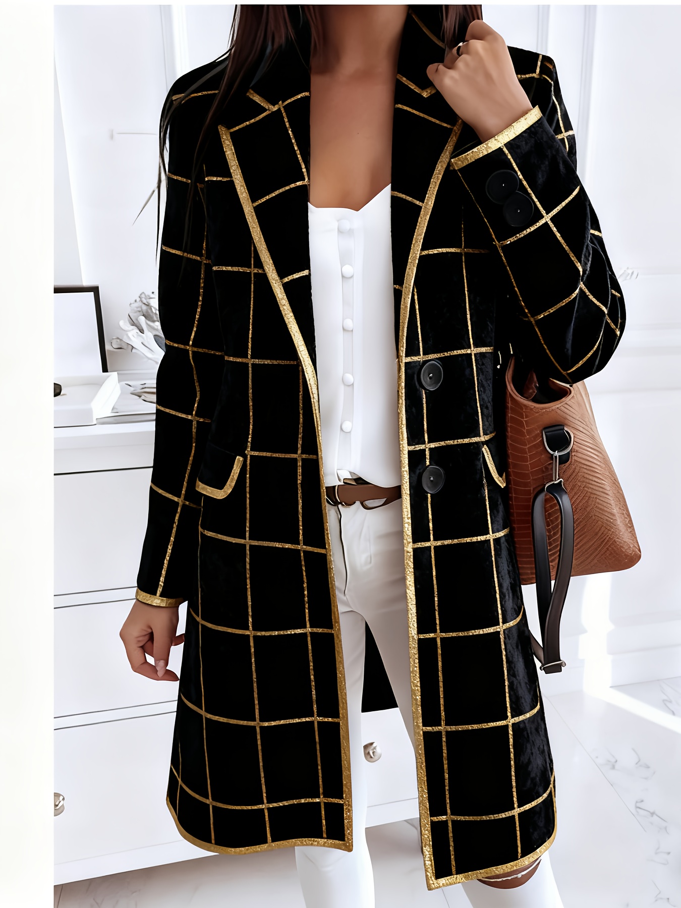 Plus-Size Women's Oversized Collar Button- Coat Jacket - Golden-Toned Houndstooth & Striped Print (Black/Golden), Winter Warmth with Chest Pocket, Machine Washable Casual & Professional Outerwear for, Parties, Everyday
