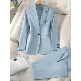 Elegant Women's Long Sleeve Lapel Blazer & Pants Set - Polyester, Machine Washable, Solid Color for Fall/Winter