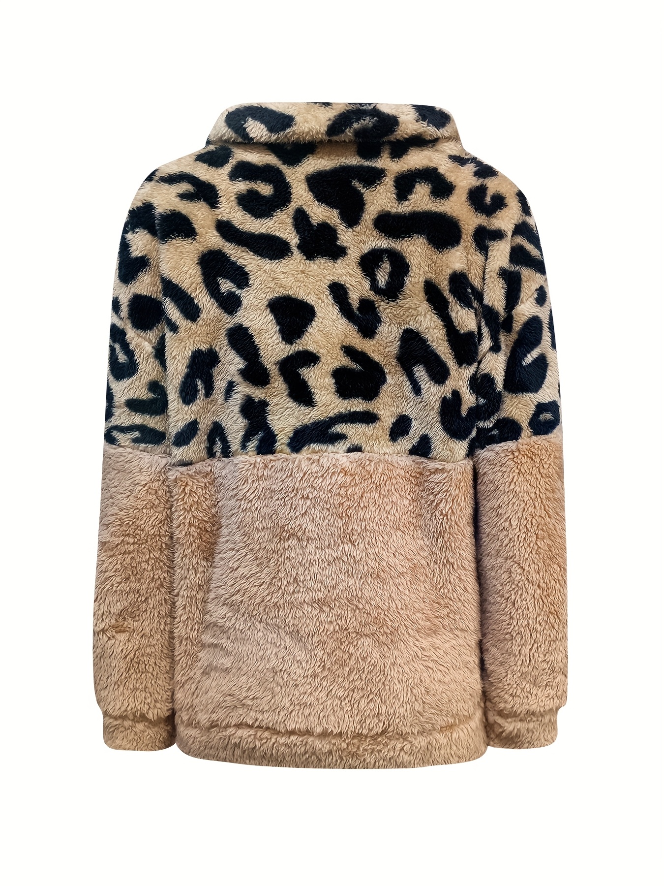 Plus Size, Winter Women's Fashion Double-Sided Polar Velvet Top with Leopard Print Long Sleeve Hoodie, Contrast Color Zipper Loose Casual Plus Size Pullover
