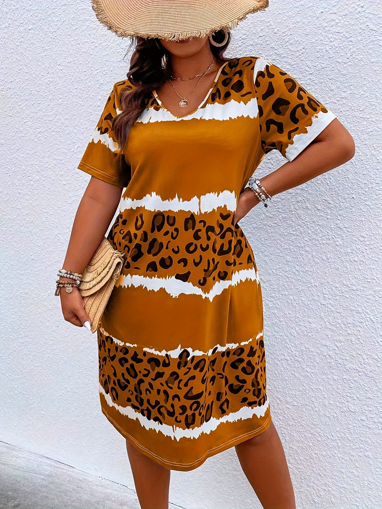 Women's Tunic Dress, Short Sleeve, Knee-Length,, Casual Summer Vacation Style, Loose Fit, Fabric, Patterned Trapeze Hem, No Belt, Pullovers Placket-