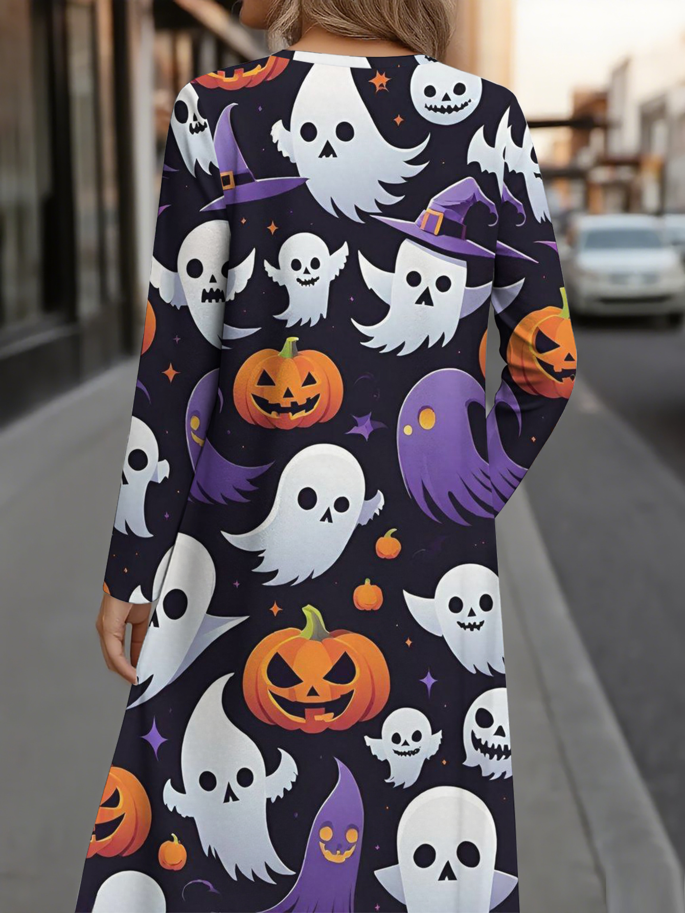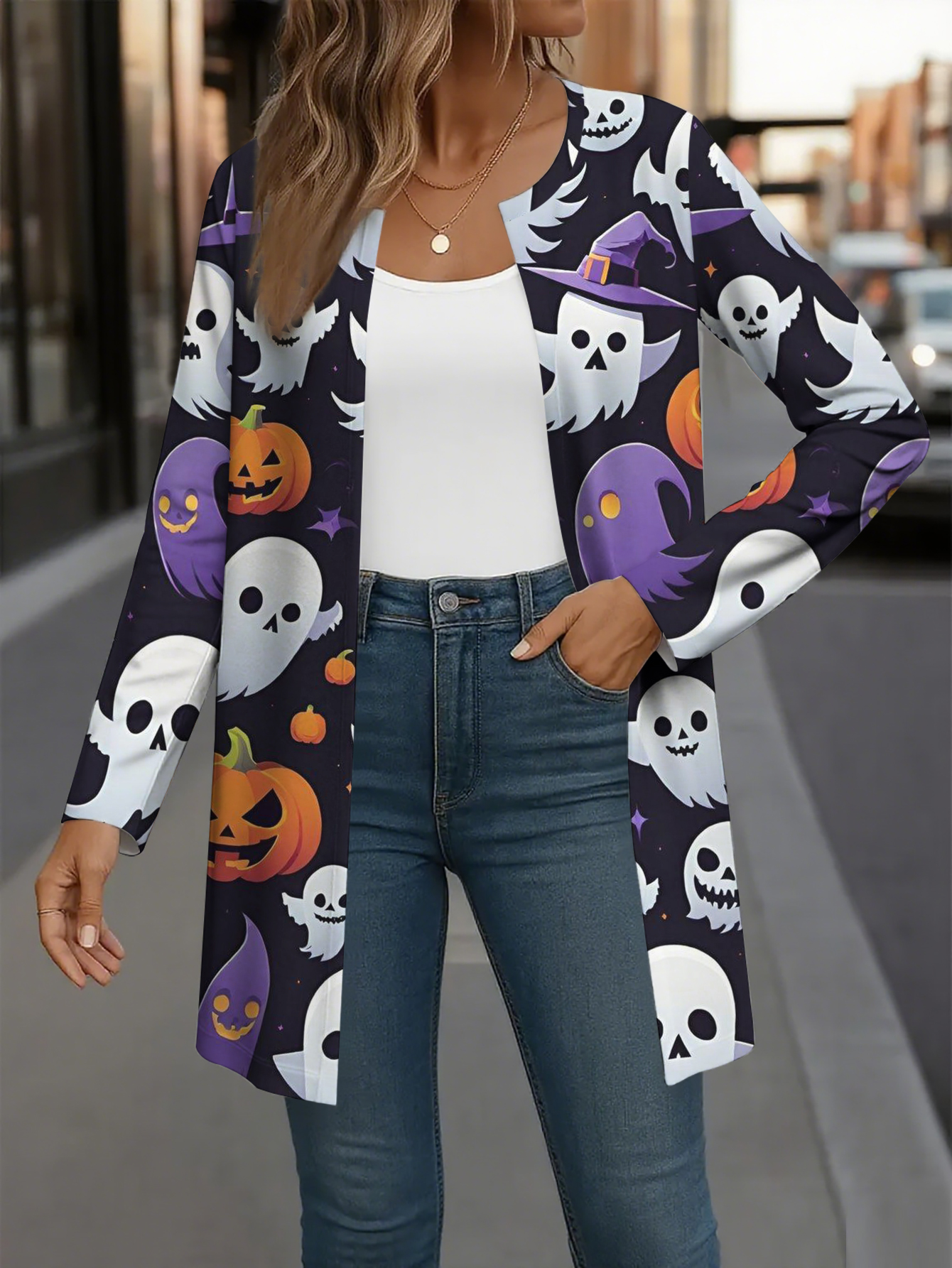 Plus Size Women'S Halloween Print Trench Coat - Spooky Ghosts Bats Pumpkins Witches Hat Design, Long Sleeve Casual Sporty Jacket, All-Season Machine Washable Outerwear for Fall Winter & Year-Round Wear, Themed Party Outfit Everyday Coat