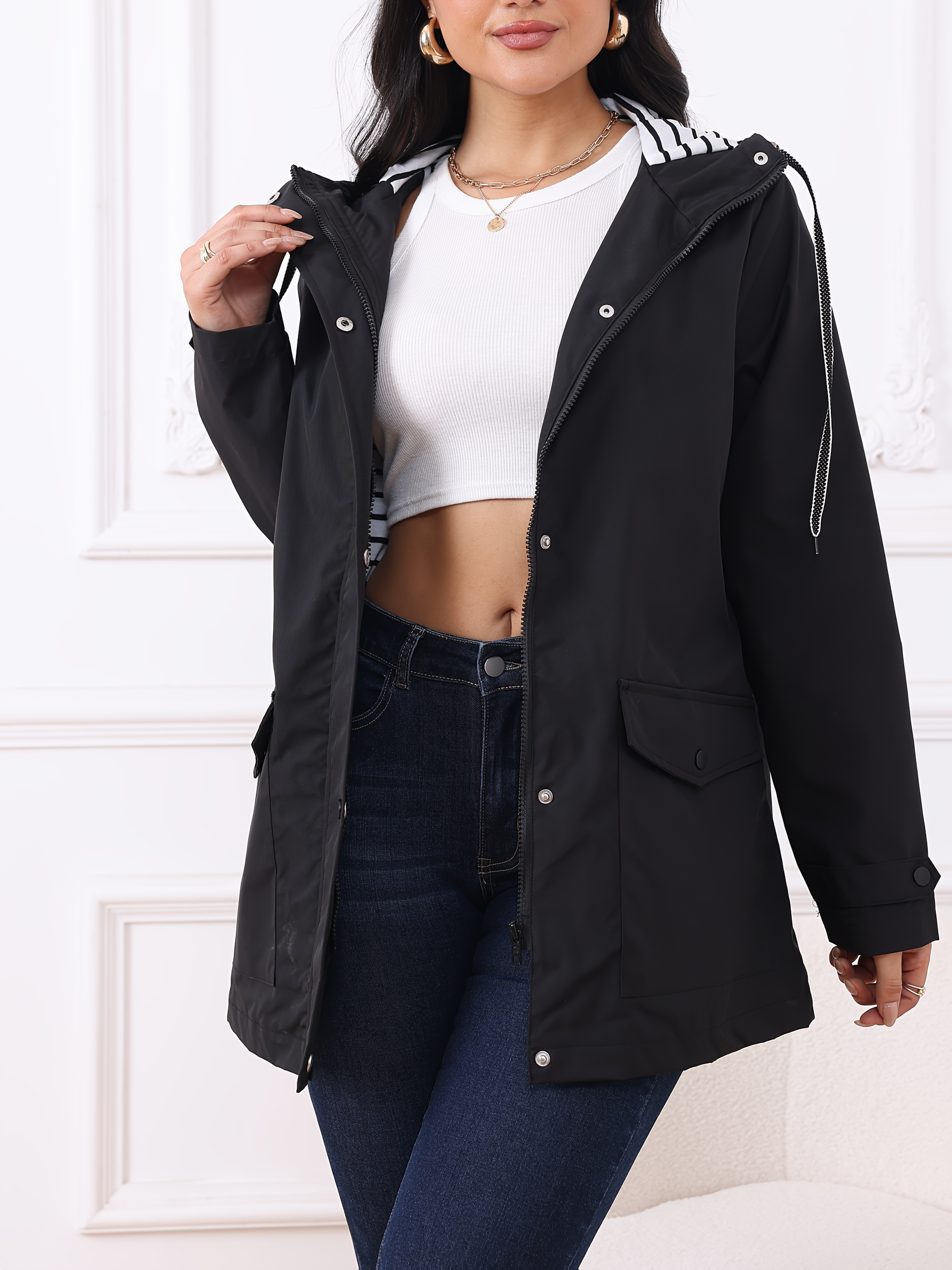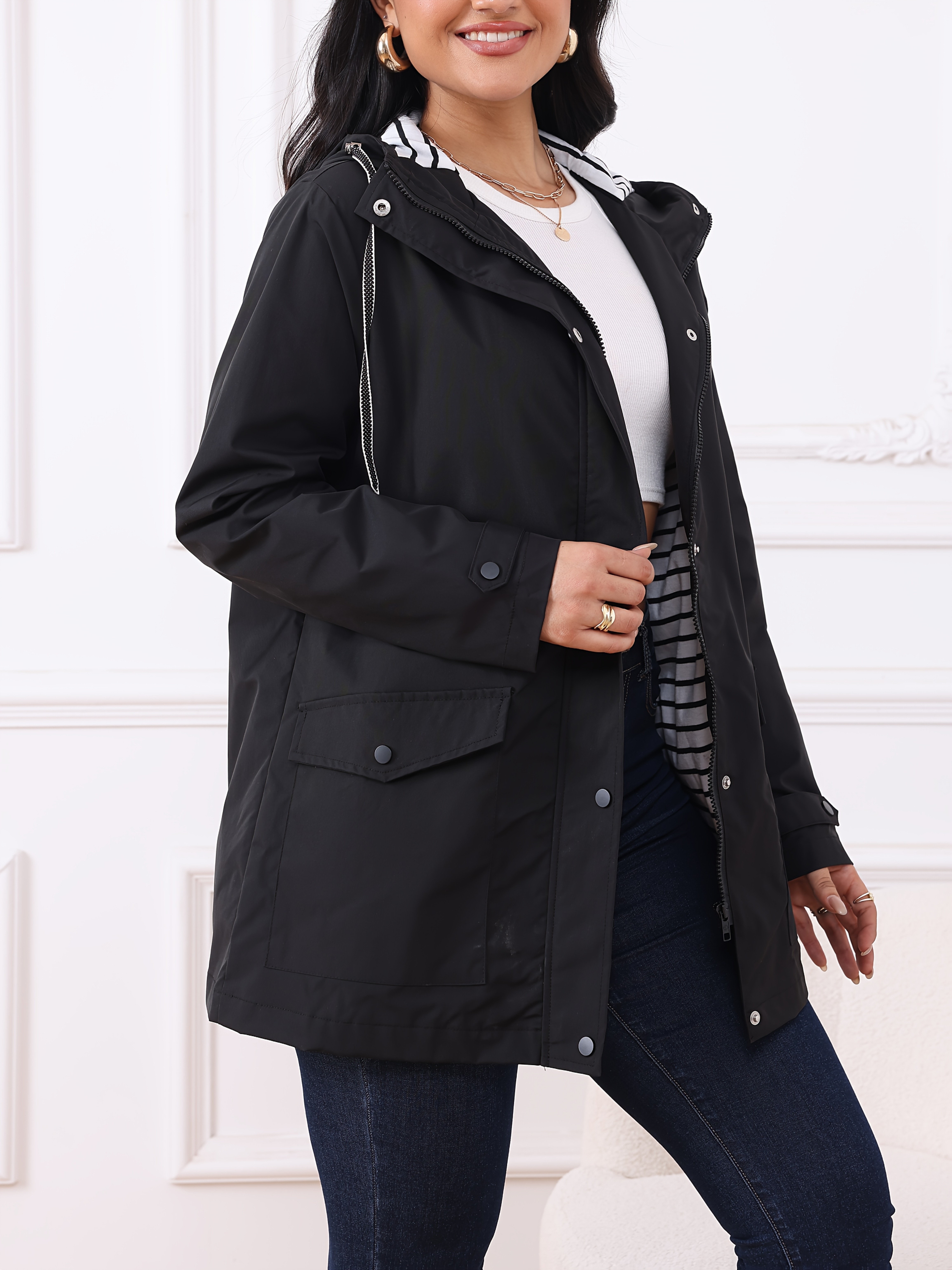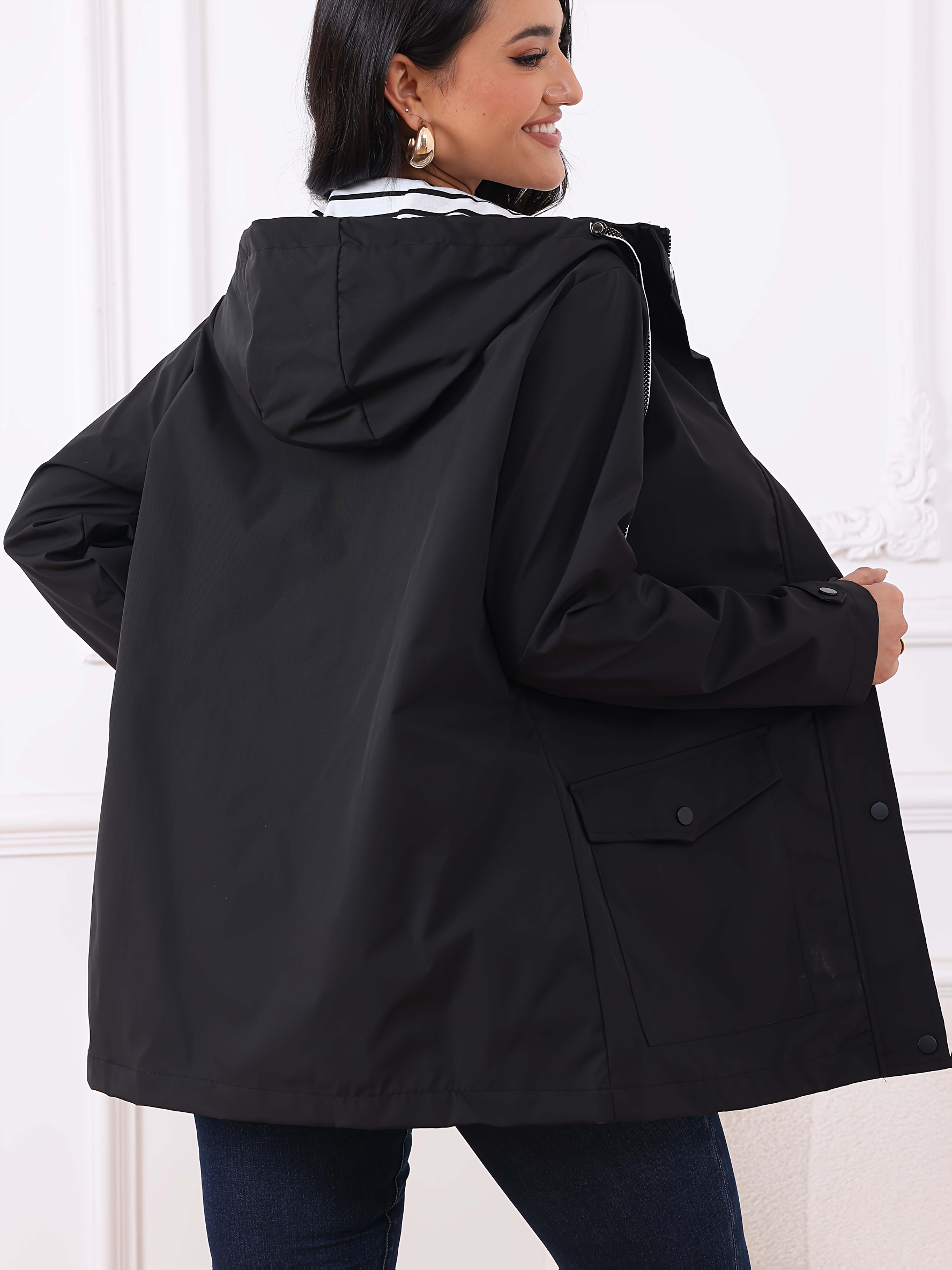 Women'S Plus Size Casual Hooded Windbreaker Jacket - 100% Polyester, Solid Color, Non-Stretch Woven Fabric, Fake Pockets, Spring/Fall Outerwear