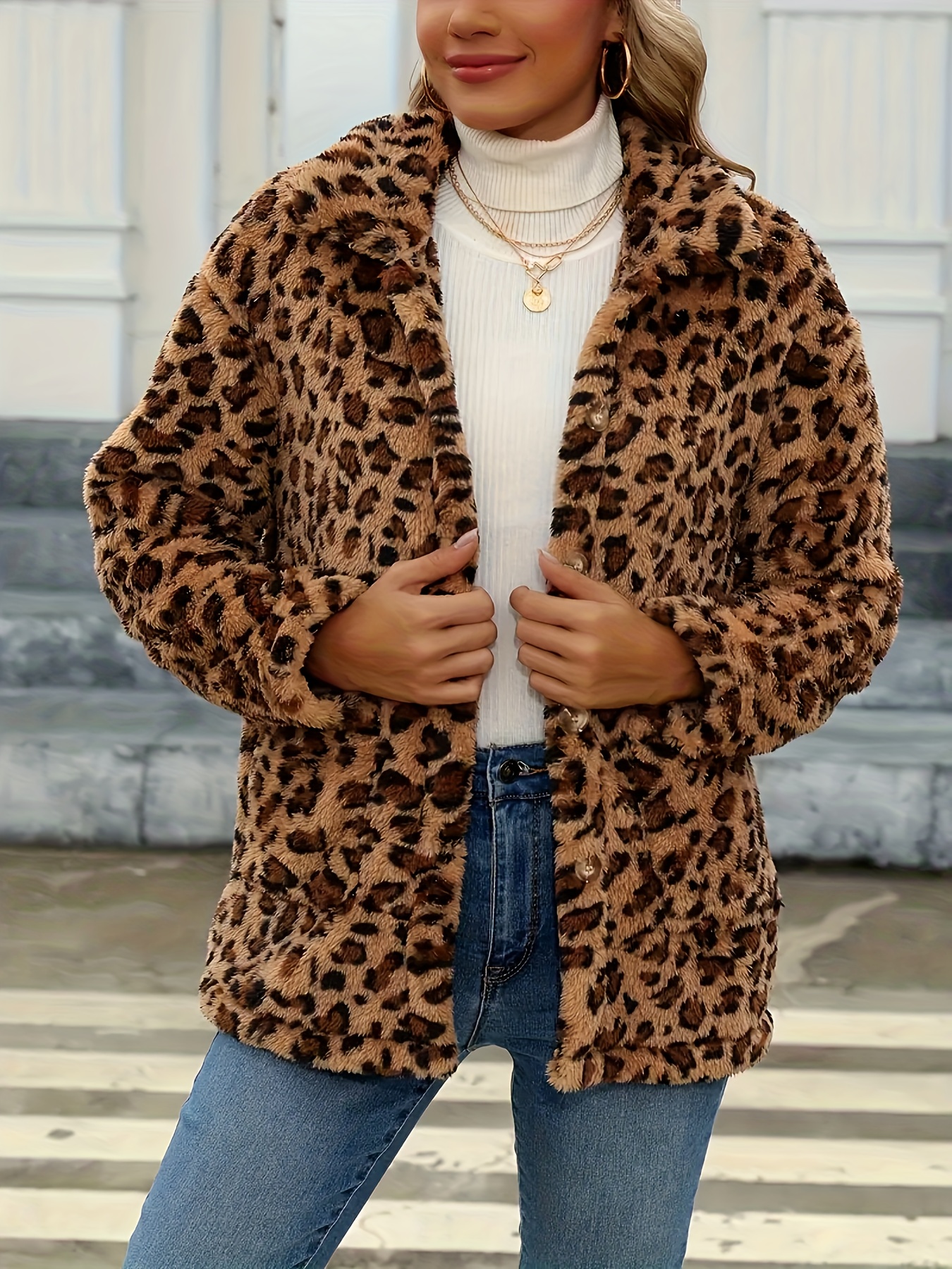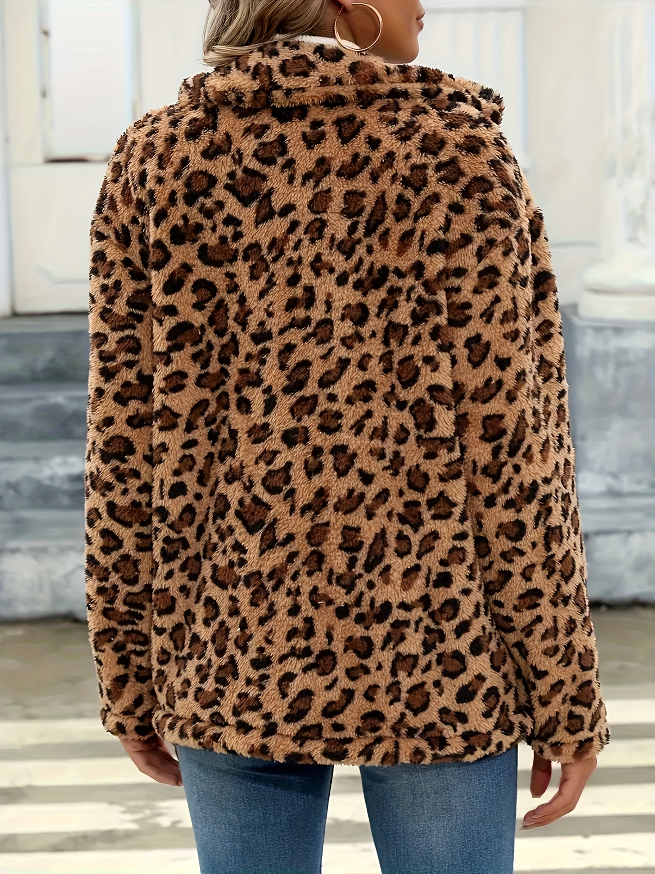 Women's Plus Size Leopard Print Faux Fur Jacket, Casual Collared Pullover, Polyester Knit Coat with Pockets, Regular Fit Long Sleeves, All-Season Fashion Outerwear