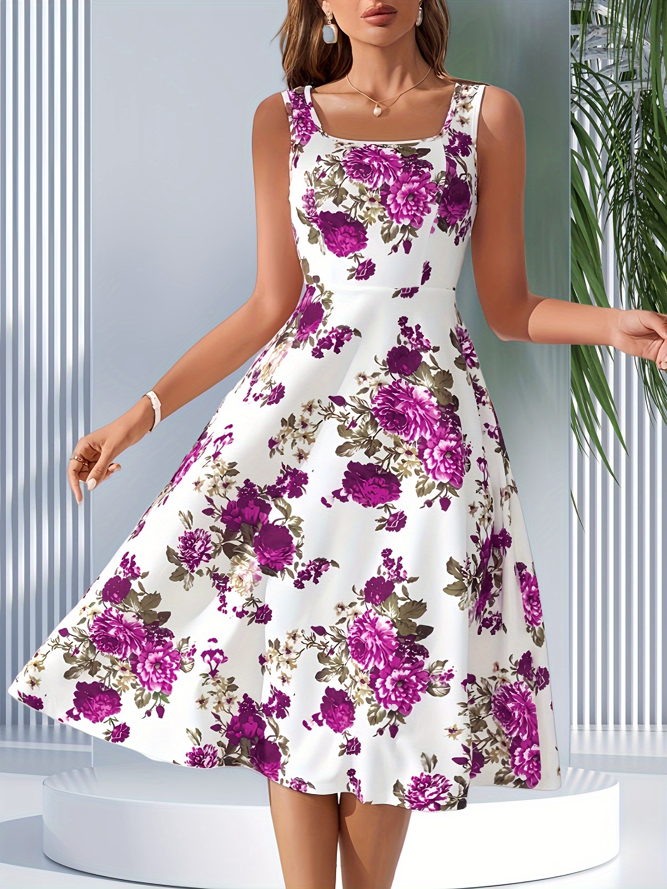 Women's Sleeveless Square Neck A-line Blue Floral Print, Spring/Summer Machine Washable, Moderately Stretchy Elegant A-line Cut, Suitable for Casual and Formal Occasions, Spring Fashion, Comfortable and Close-fitting, Non-transparent Fabric